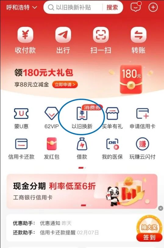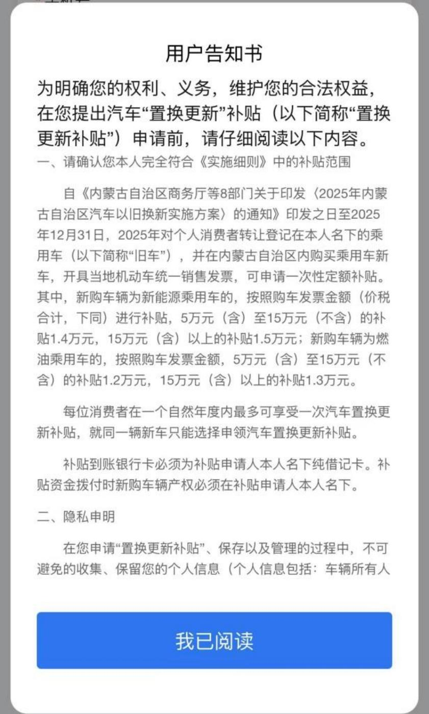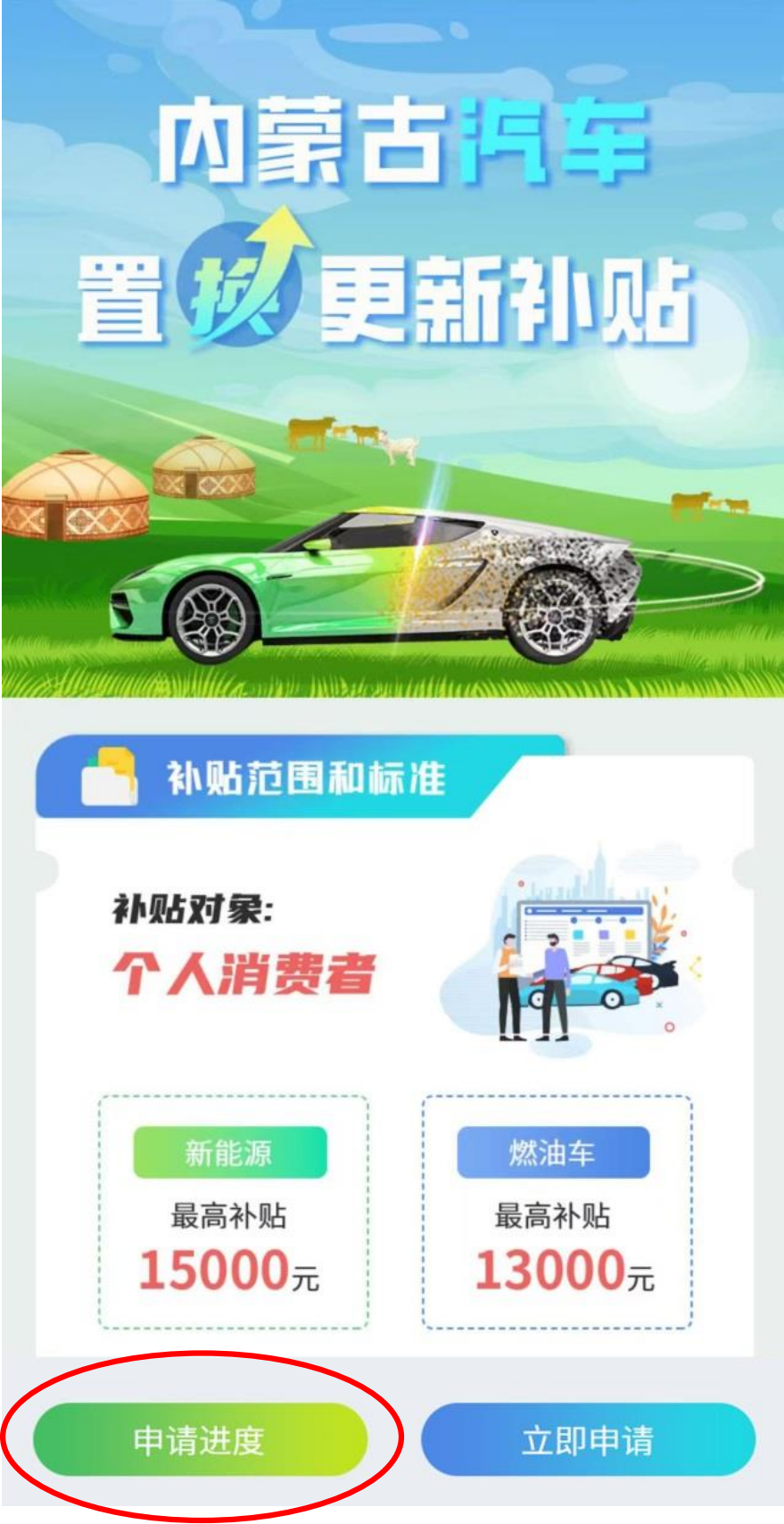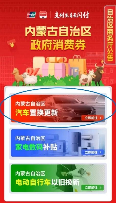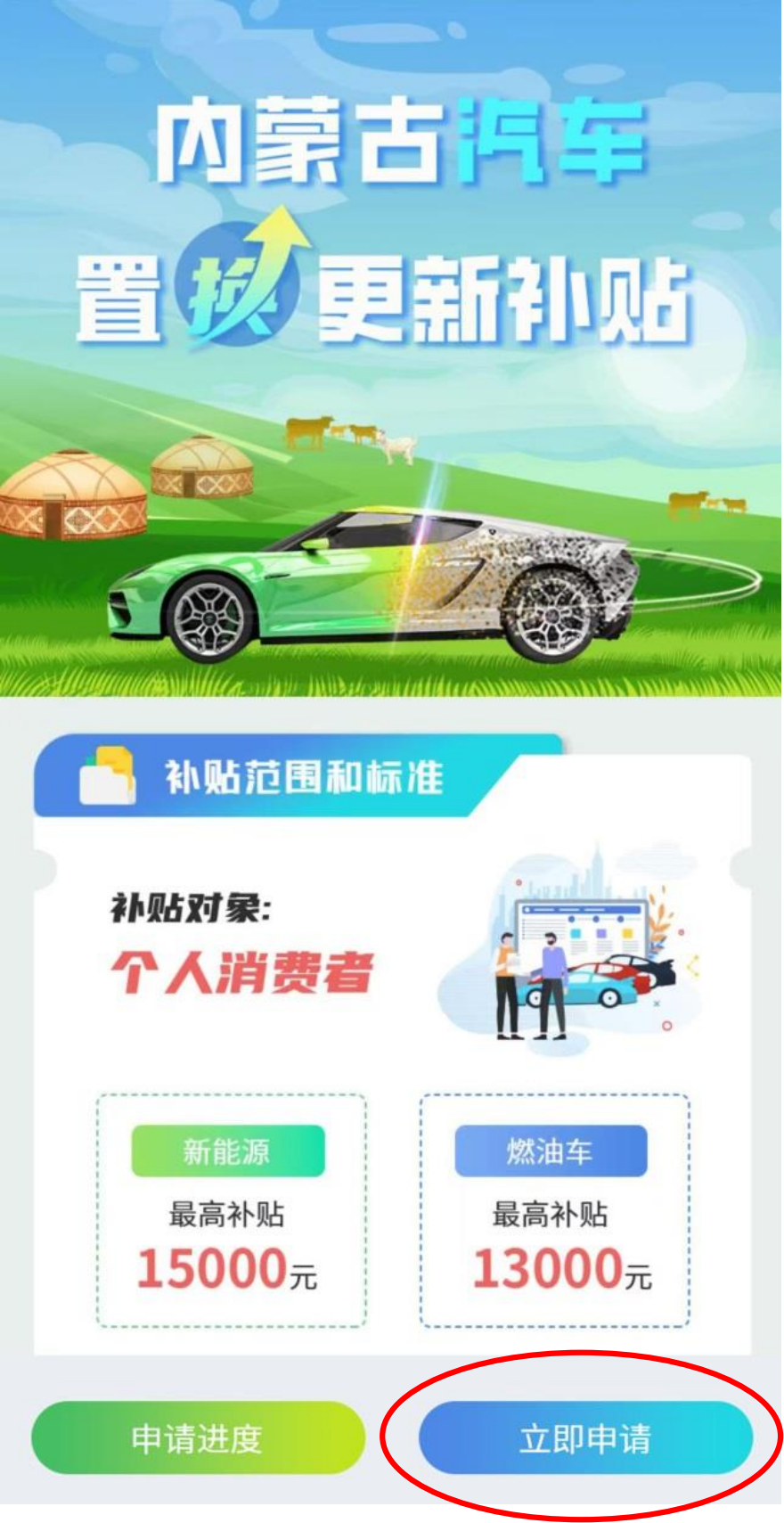补贴申请人通过云闪付 APP 首页“以旧换新”——“以旧换新优惠合集”,可点击打开“内蒙古汽车置换更新平台”小程序,或使用搜索功能打开“内蒙古汽车置换更新平台”小程序,选择购置新乘用车的《机动车销售统一发票》开具地(市级),根据系统提示准确填报信息,并清晰完整地上传相关证明材料,逾期不予受理。