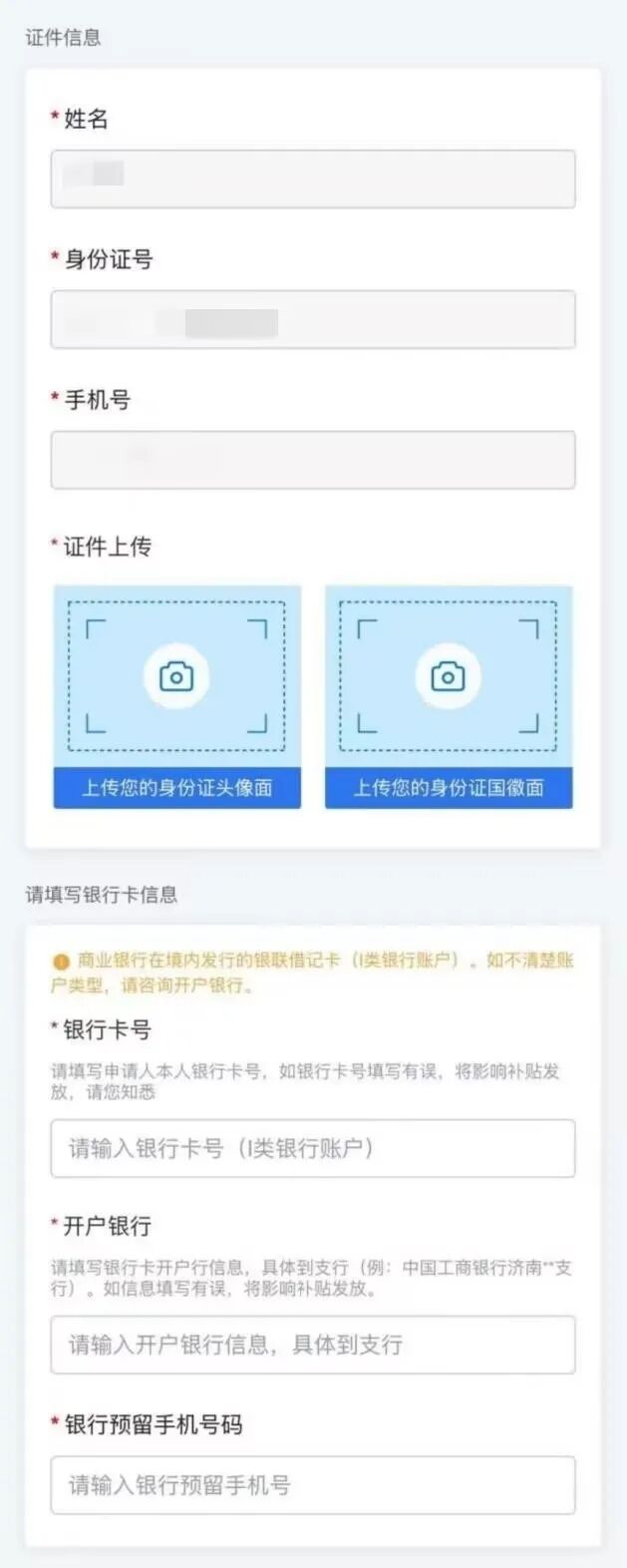 申请人信息包含证件信息和银行卡信息。补贴申请人 可根据页面提示分别上传本人身份证正、反面图片,填写本人银行卡号、开户银行、银行预留手机号信息。