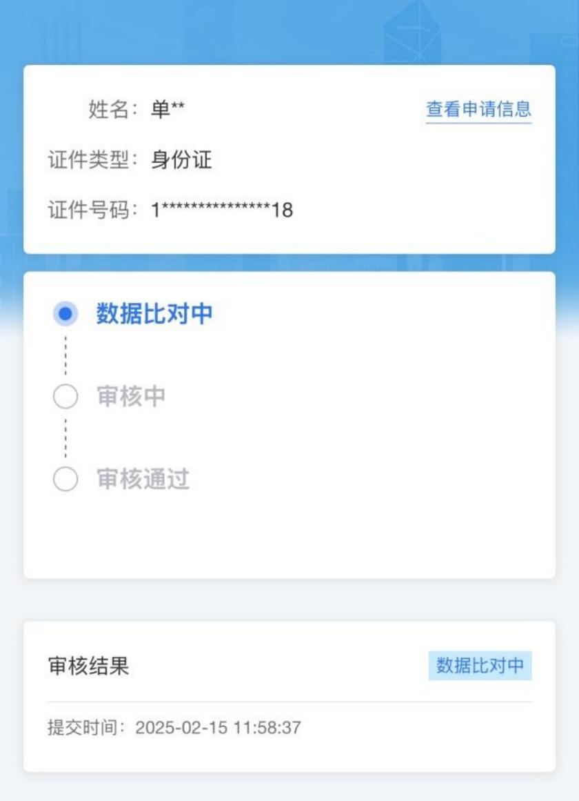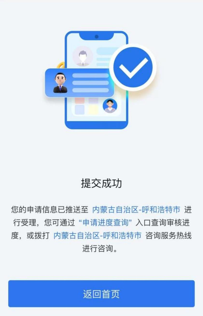 申请人信息提交成功后,通过首页【申请进度】,可查看受理审核进度。