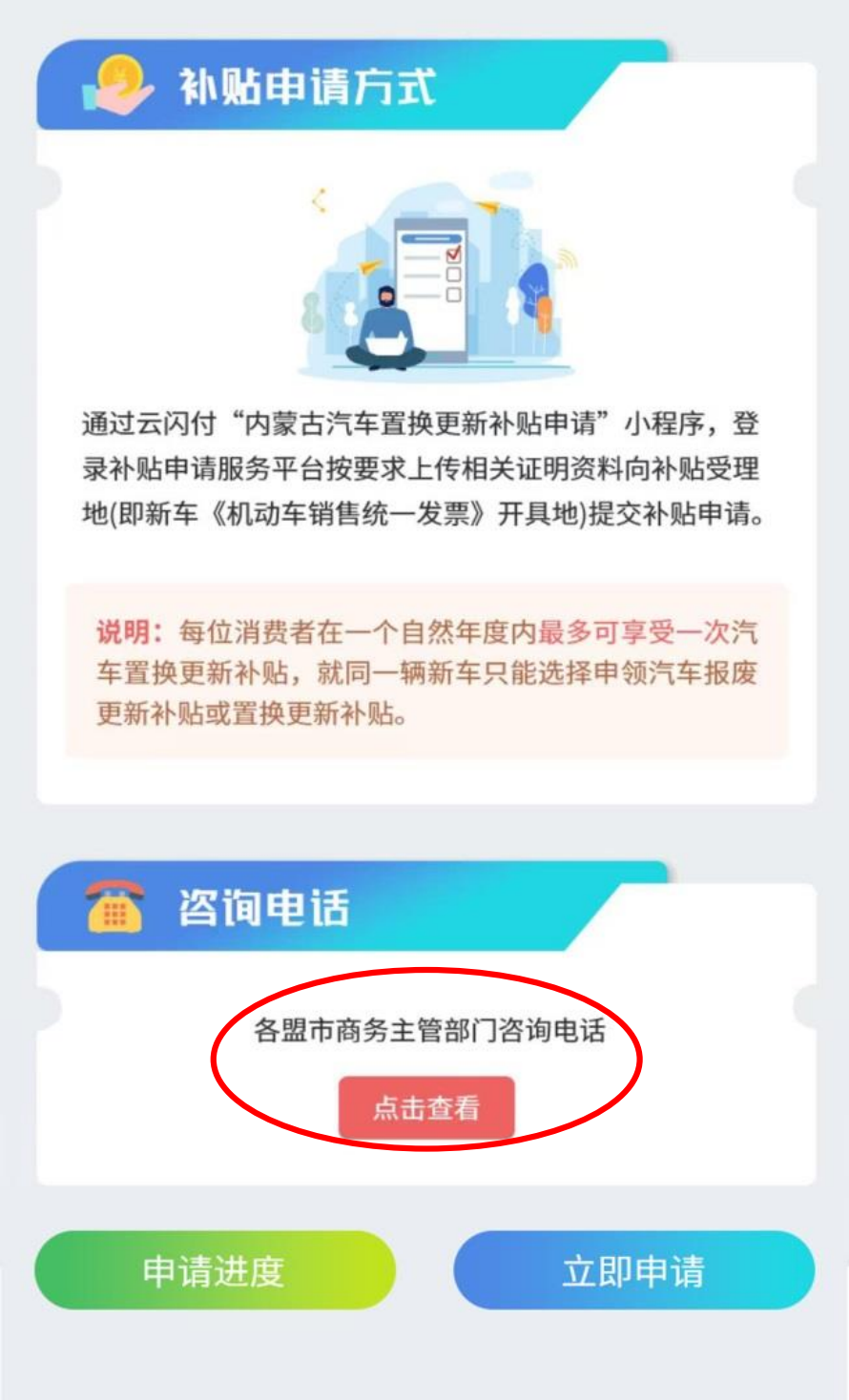 补贴申请人可点击“咨询电话”,获取“各盟市商务主管部门咨询电话”。
