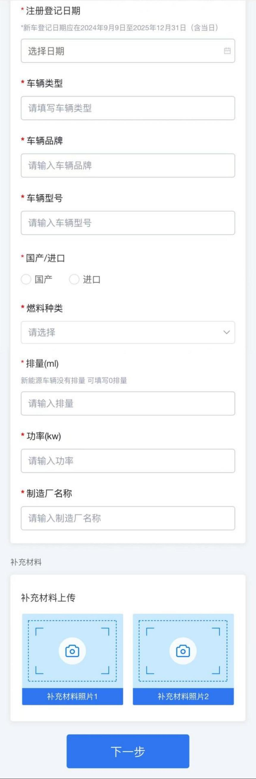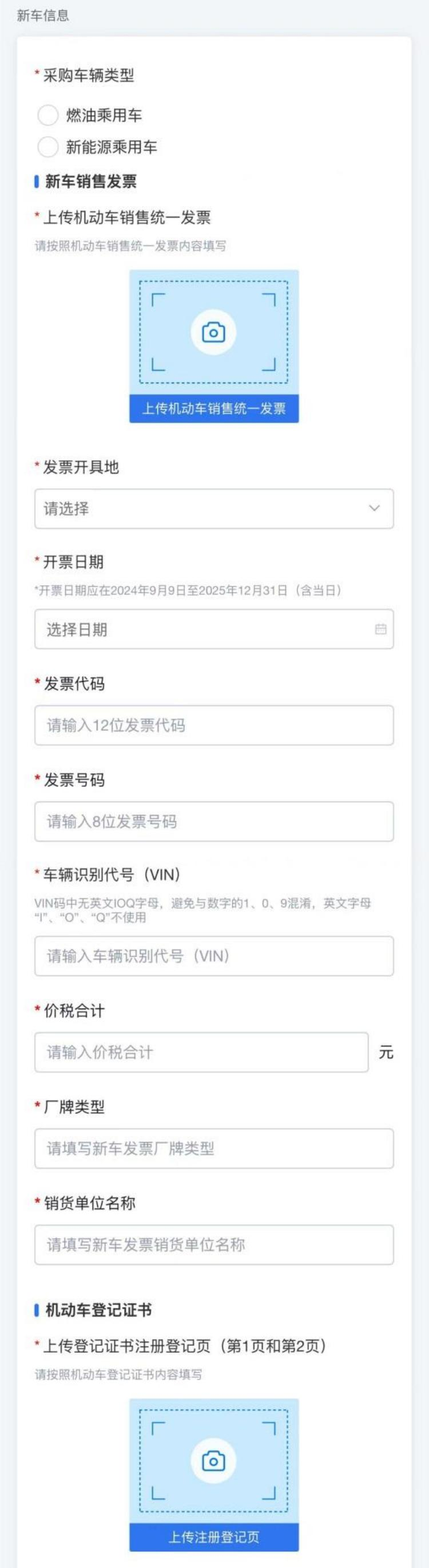 根据页面提示,补贴申请人需上传《机动车销售统一发票》,选择发票开具地,填写开票日期、发票代码、发票号码等发票信息;上传新车的《机动车登记证书》 第1页和第2页,填写注册登记日期、车辆类型等所购新车详细信息。