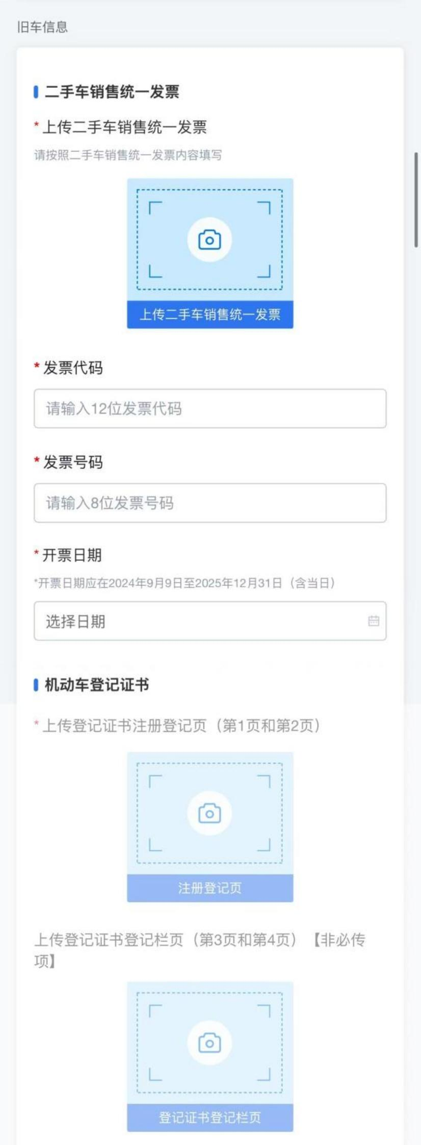 根据页面提示,补贴申请人需上传《二手车销售统一发票》,填写发票代码、发票号码、开票日期;上传二手车的《机动车登记证书》第1页至第4页(第3页和第4页为非必传项),填写登记日期、转让登记日期、车辆识别代号、车牌号码等旧车详细信息。