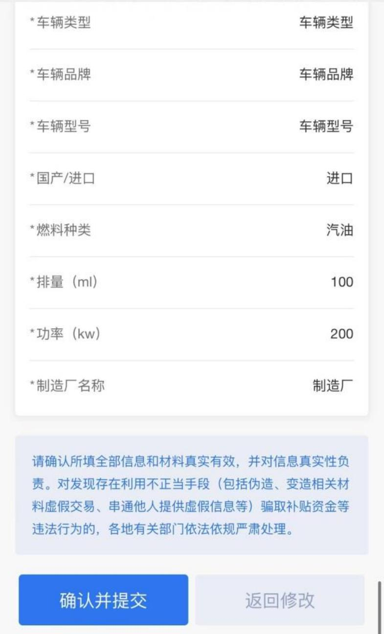 补贴申请人需确认所填信息分别与所购新车《机动车销售统一发票》、《机动车登记证书》上的内容保持一致。
